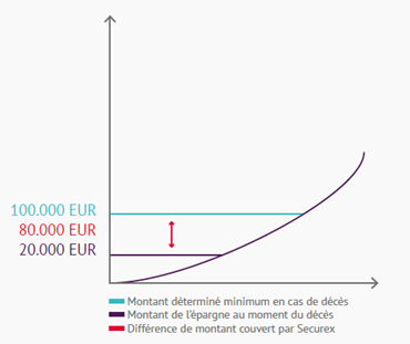 - Defined amount: you define in advance the minimum amount that your loved ones will receive. Have you not yet saved this amount at the time of your death? Securex covers the difference. Have you already saved more than expected? Then Securex pays the total amount of your savings to your surviving relatives.
