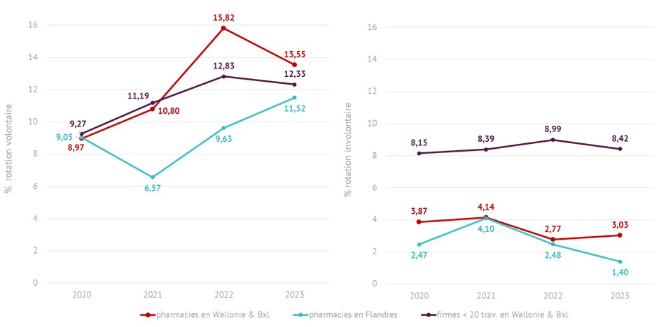 L'augmentation de la rotation du personnel dans les pharmacies wallonnes et bruxelloises entre 2020 et 2023 est uniquement due à la rotation volontaire (en forte hausse de 51,2%), étant donné que la rotation involontaire a connu une baisse (-21,5%) et que le pourcentage de salariés quittant le marché du travail est resté stable.