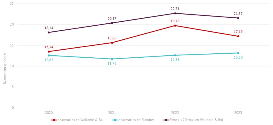 Le taux de rotation du personnel dans les pharmacies wallonnes et bruxelloises a augmenté entre 2020 et 2022, et a légèrement diminué en 2023 (+27% entre 2020 et 2023). Les employés des entreprises wallonnes et bruxelloises de moins de 20 salariés ont suivi une évolution similaire mais moins prononcée (+18,9%). Dans les pharmacies flamandes, la rotation du personnel est restée plutôt stable.