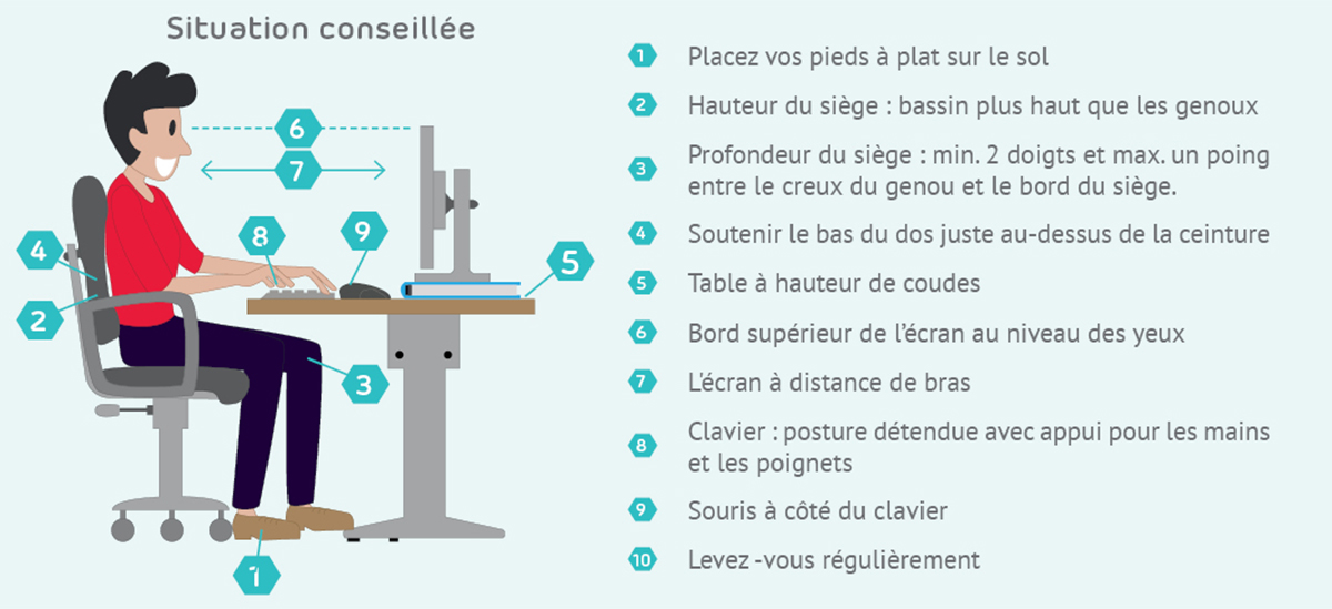 Une bonne posture commence par un équilibre entre le poste de travail, le siège de bureau et votre assise. La position de travail idéale répond à 10 règles simples.