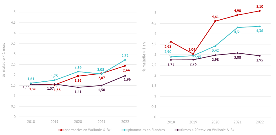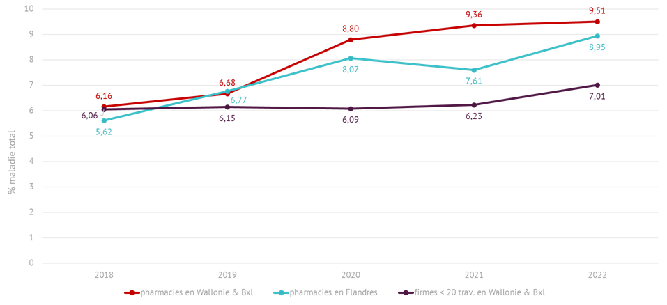 L'absentéisme dans les pharmacies wallonnes et bruxelloises a connu un pic lors de la pandémie de corona et n'a pas diminué depuis. L'absentéisme dans les pharmacies flamandes suit la même tendance, mais de manière un peu moins dramatique. Chez les autres employeurs bruxellois et wallons de moins de 20 travailleurs, l'absentéisme est resté plutôt stable et nous n'observons qu'une légère augmentation en 2022. Le taux de maladie global dans les pharmacies est donc nettement plus élevé en 2022 qu'en 2019, l'année précédant la pandémie . Pour les pharmacies wallonnes et bruxelloises, le chiffre de 2022 est supérieur de 42,36 % à celui de 2019, pour les pharmacies flamandes de 32,20 %, pour les employeurs wallons et bruxellois de moins de 20 travailleurs de 13,98 % seulement et pour l'ensemble du marché du travail belge de 11,73 %.