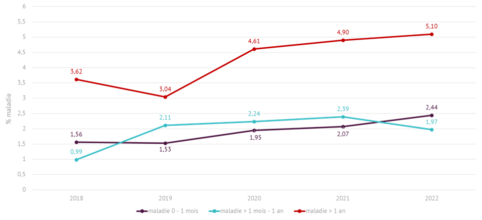 Figure 2 – Evolution des taux de maladie par durée dans les pharmacies wallonnes et bruxelloises de moins de 20 travailleurs