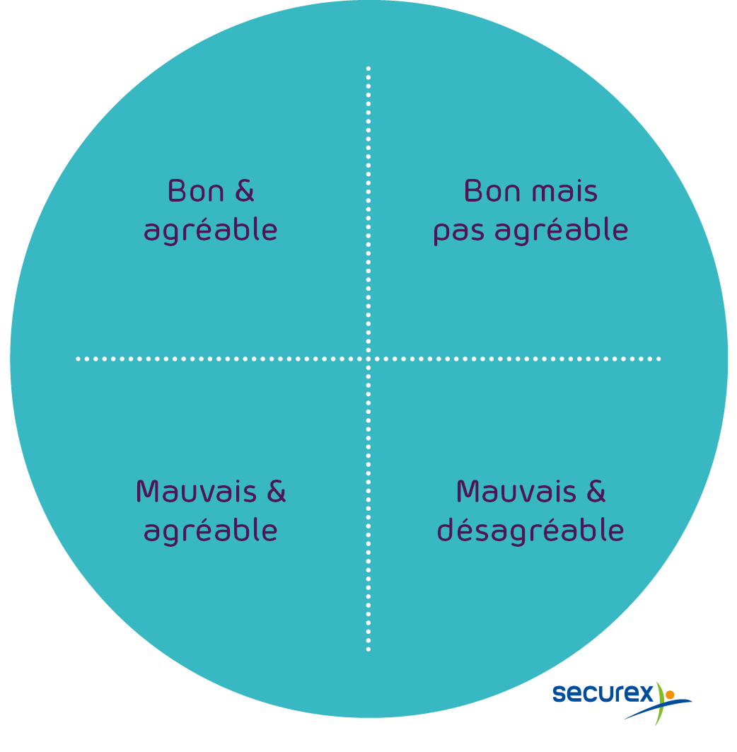 Prenez une feuille vierge, ou partez d’un tableau blanc. Dans le coin supérieur gauche, écrivez « bon et agréable ». Dans le coin supérieur droit, écrivez « bon mais pas agréable ». Dans le coin inférieur gauche, indiquez « mauvais et agréable », et enfin, « mauvais et désagréable » dans le coin inférieur droit. Tirez des traits entre le tout de façon à obtenir quatre quadrants.