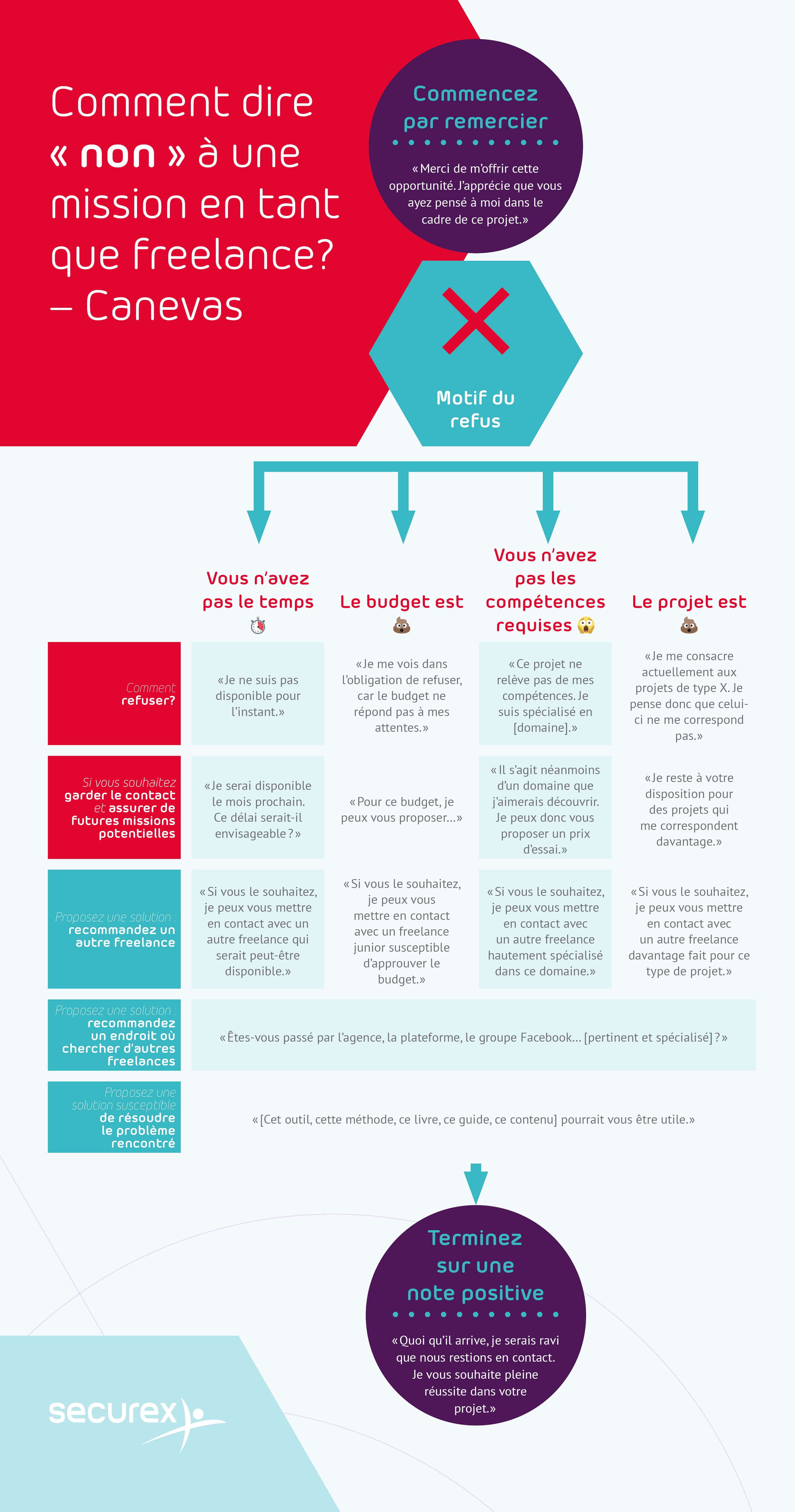 Vous trouverez, dans ce canevas, des phrases types qui vous seront utiles si vous devez refuser un projet avec politesse, soit parce que vous n’avez pas le temps, soit parce que le projet ne relève pas de vos compétences.