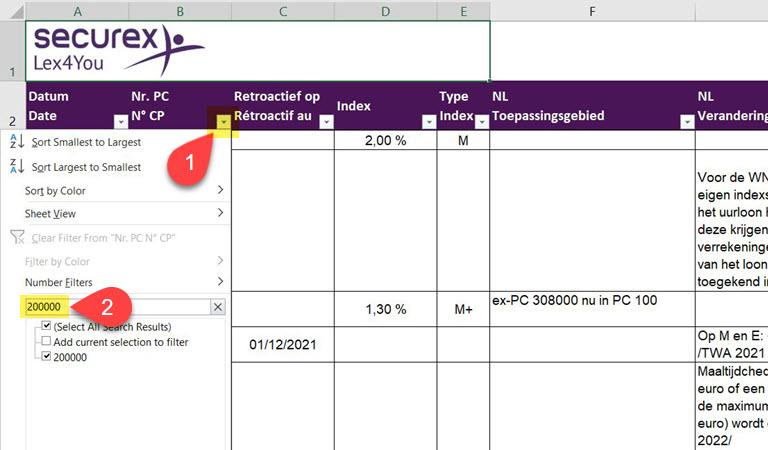 Filtrez la colonne n° CP par le terme de recherche 200000 pour vérifier s'il y a un ajustement des salaires dans la Commission paritaire n° 200 ce mois-ci.