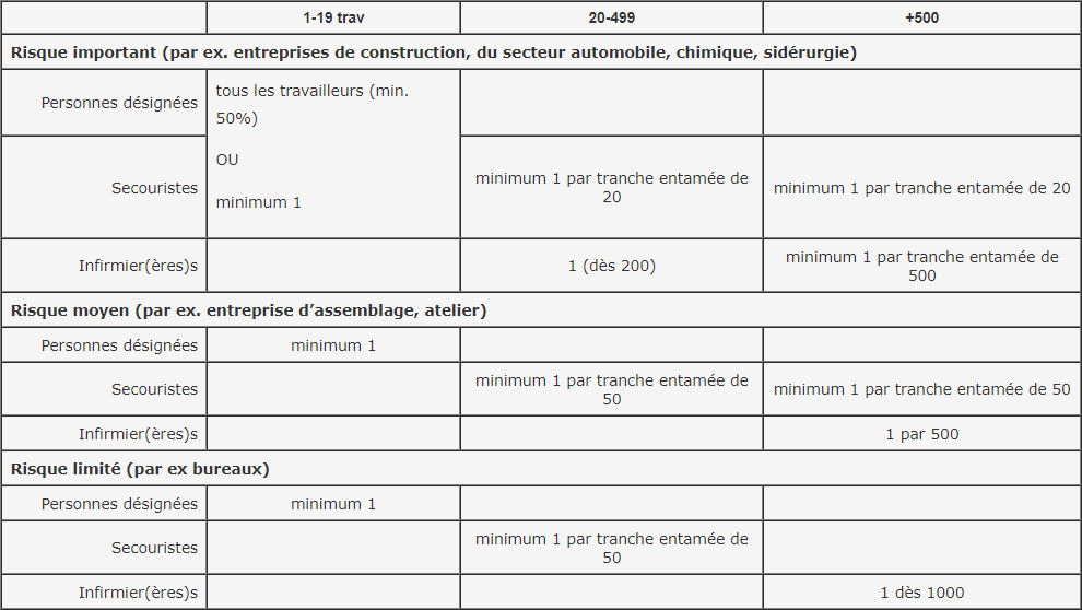 Remarque : Les inspecteurs sociaux peuvent toujours imposer une autre répartition du personnel chargé de dispenser les premiers secours.