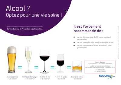 Devenez partenairePour limiter les risques pour la santé liés à la consommation d’alcool, le Conseil Supérieur de la Santé recommande notamment de limiter sa consommation d’alcool et de ne pas boire plus de 10 unités standard d’alcool par semaine, à répartir sur plusieurs jours.