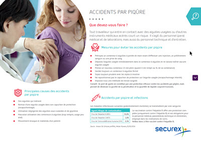 Devenez partenaireUn accident par piqûre peut arriver à n'importe qui. Mais les conséquences peuvent être graves. Comment limiter les risques et que faire en cas d'accident ? Ce toolbox fournit quelques conseils pratiques.