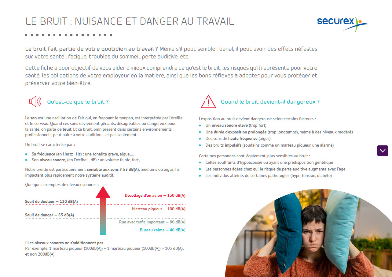 Devenez partenaireFatigue, stress, troubles du sommeil, perte auditive… Le bruit au travail peut avoir de nombreuses conséquences sur votre santé. Il perturbe aussi la communication et augmente le risque d’accidents.