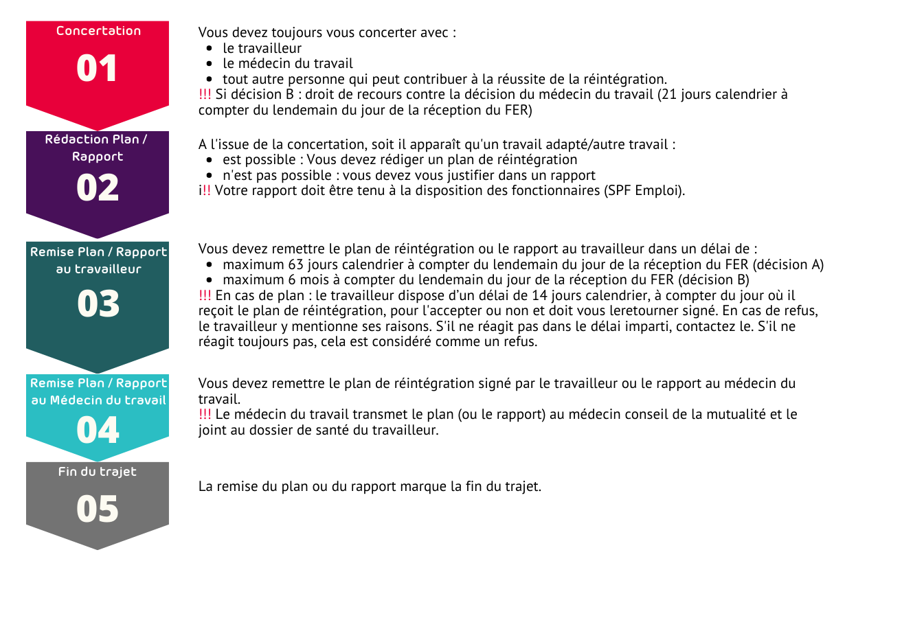 Un employeur qui, après la concertation et l'examen des possibilités concrètes de travail adapté ou d'autre travail et d'adaptions du poste de travail, ne peut pas établir de plan de réintégration, établit un rapport motivé dans lequel il explique pourquoi :