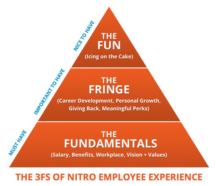 Zoals vele andere vooruitdenkende bedrijven over de hele wereld, besliste ook de onderneming Nitro, ontwikkelaar van commerciële software, om haar traditionele HR-mechanismen volledig door elkaar te schudden. Nitro heeft bijgevolg een uniek “employee experience”-model opgezet dat in de eerste plaats zal zorgen voor de bescherming en de ondersteuning van zijn werknemers. Het “employee experience”-model van Nitro is gericht op drie hoofdpijlers, de zogenaamde drie F’en – de Fundamenten, de Franje en de Fun. De blauwdruk van de 3 F’en van “employee experience” legt de vinger op de pols van elke business: Hoe top zijn in je vak en tegelijk een “employer of choice” zijn?