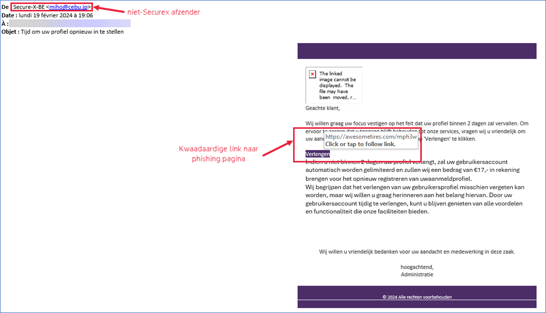 Klik zeker niet op de link in de e-mail. Stuur de e-mail door (forward) naar verdacht@safeonweb.be en helpdesk@securex.be. Verwijder daarna de e-mail uit je mailbox.