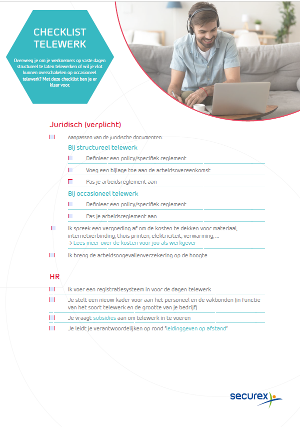 Telewerk neemt steeds meer omvang in het dagelijkse reilen en zeilen van bedrijven. Hier zijn verschillende redenen voor: minder lang onderweg zijn, beter evenwicht tussen werk en privéleven, meer flexibiliteit wat betreft werkuren, ...
