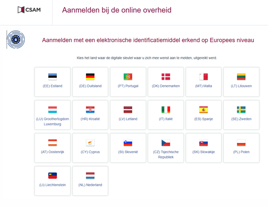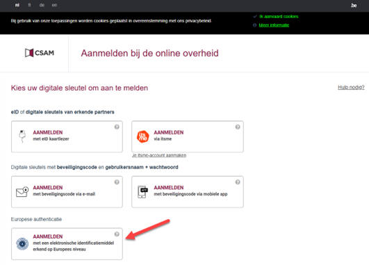 - Klik op ‘Aanmelden met een elektronisch identificatiemiddel erkend op Europees niveau’