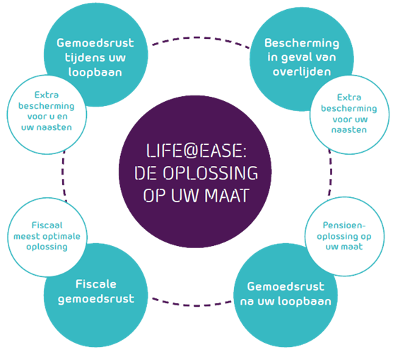 Life@Ease is een formule op maat. Ze beschermt jou en je gezin bij ongevallen, ziekte of overlijden. En ook interessant: Life@Ease houdt rekening met de geldende fiscale regels. Gevolg? Je betaalt minder belastingen (belastingsvoordeel kan oplopen tot 70% van uw premie).